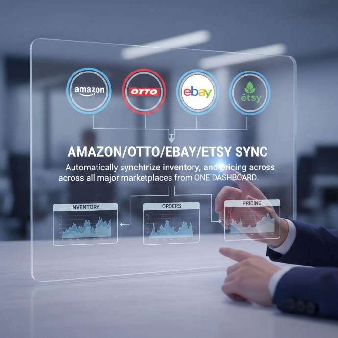 Ihre eigene E-Commerce-Website sowie Amazon, OTTO, eBay, Etsy und andere große Marktplätze – alle von einem Dashboard aus synchronisiert.